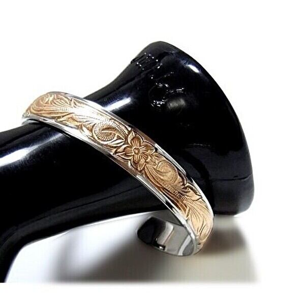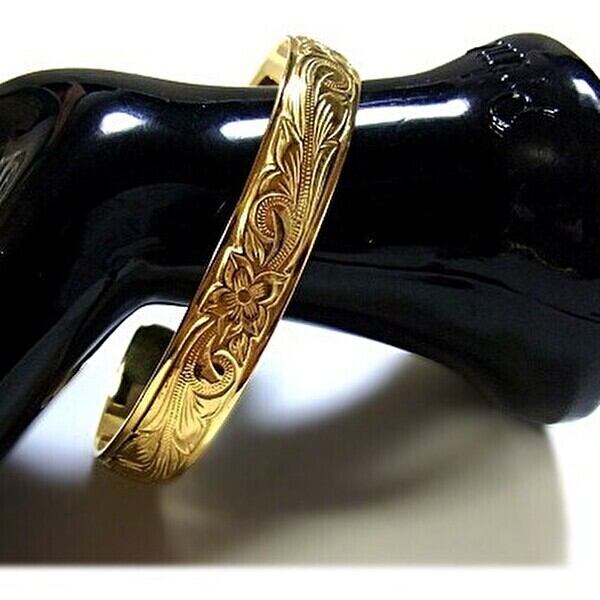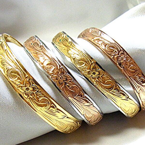 広めの地金に、ハワイアンジュエリーの職人が、プルメリアとナルのトラディショナルなカレイキニデザインをモチーフに繊細かつ緻密に彫り上げた、上品なバングルです。